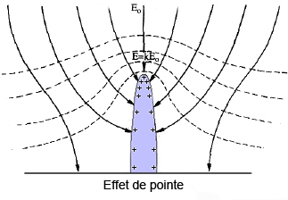 L'effet de pointe décrit l'accumulation accrue de charges électriques sur les zones à faible rayon de courbure (pointes) d'un conducteur. La densité de charge en surface est inversement proportionnelle au rayon de courbure, d'où un champ électrique plus intense près des pointes.